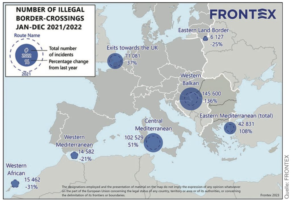 Bei den maritimen Routen der illegalen Einreiseversuchen nimmt für Europa die zentrale Mittelmeerroute von Nordafrika Richtung Italien aktuell die bedeutendste Stellung ein: „Die Zahl der auf der zentralen Mittelmeerroute verzeichneten Fälle stieg um mehr als die Hälfte auf deutlich über 100.000. Hier belegten Migrantinnen und Migranten aus Ägypten, Tunesien und Bangladesch die ersten drei Plätze in der Statistik – in einem Jahr, in dem die Zahl der aus Libyen in der Region angekommenen Menschen den höchsten Stand seit 2017 und die der Ankömmlinge aus Tunesien einen Höchststand in der jüngeren Geschichte erreichte.“