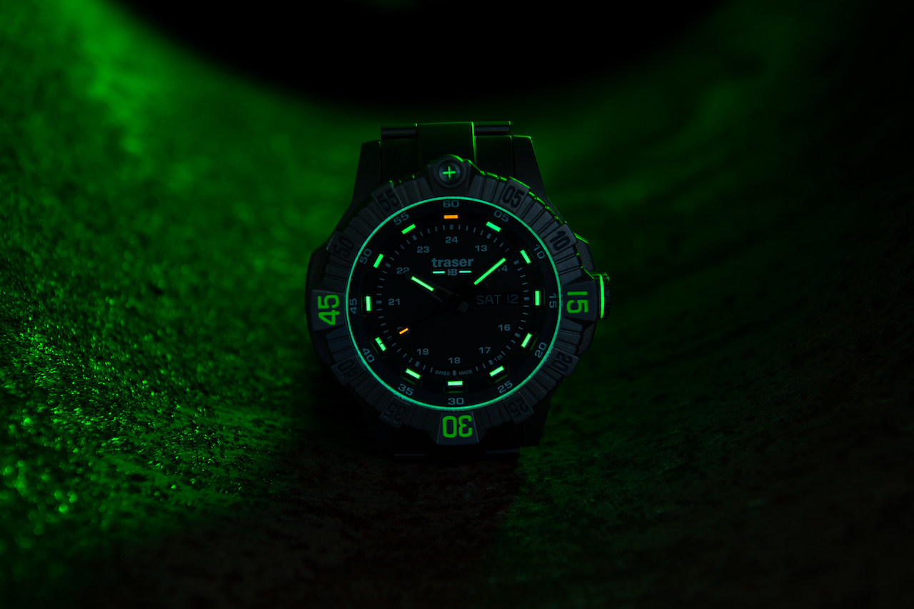 Die enorme Widerstandskraft der P99 T Tactical kombiniert traser mit der uneingeschränkten Anzeige der Zeit dank der trigalight Technologie. Das Unternehmen entwarf diese für die erste selbstleuchtende Uhr der Welt und den Nutzer U.S. Army. Damit bietet die P99 auch bei völliger Dunkelheit und herausfordernden Sichtverhältnissen eine optimale Ablesbarkeit. Die haarfeinen Kapillaren, deren Lumineszenz vollkommen autark und konstant über Jahre währt, sind auf den Zeigern und dem Zifferblatt appliziert und bieten bei der beidseitig drehbaren Lünette in Form eines Fadenkreuz-Inserts an Zwölf-Uhr zusätzliche Orientierung.