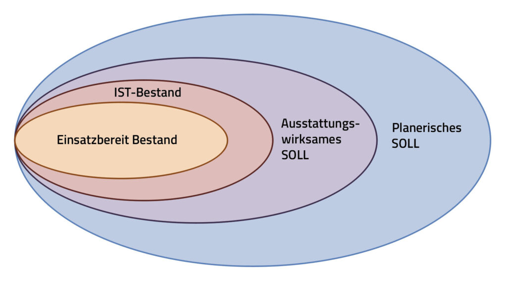 Für die Berechnung des „Ausstattungsgrades“ als Kennzahl für die materielle Einsatzfähigkeit ist die Art und Weise des Verständnisses eines „SOLL“ essentiell. Da gibt es einerseits das planerische SOLL, das den tatsächlichen Bedarf an einem Material zur vollständigen Abbildung einer Fähigkeit wiedergibt. Andererseits gibt es das sogenannte ausstattungswirksame SOLL. Hiermit wird der vom Haushalt gebilligte Umfang, also die Menge, die tatsächlich beschafft wird, beschrieben. Das ausstattungswirksame SOLL ist häufig (deutlich) geringer als das planerische SOLL. Das Zusammenspiel zwischen den verschiedenen Werten lässt sich grafisch vereinfacht darstellen: