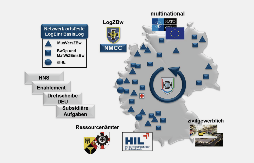 Auch das Netzwerk der Basislogistik im Inland muss mit den sich ändernden sicherheitspolitischen Rahmenbedingungen Schritt halten. Primäres Ziel ist die Gewährleistung einer effektiven, reaktionsschnellen und durchhaltefähigen logistischen Leistungserbringung. Hierzu sind u.a. die eigene Robustheit mittels der Erweiterung organischer Kapazitäten zu steigern und die relevanten logistischen Einrichtungen im Inland bedrohungsangepasst zu schützen.