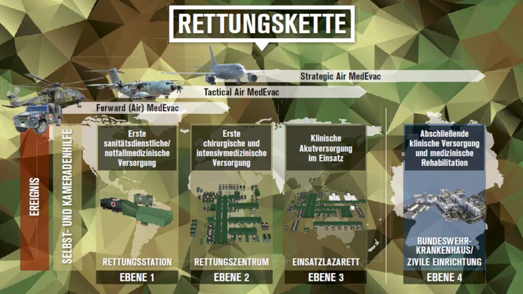 Denn die materielle Befähigung zum Kampf ist nur ein Bestandteil für den Erfolg auf dem Gefechtsfeld. Vielmehr sind die Moral und der Kampfeswille jedes einzelnen Soldaten ein Schlüsselfaktor zur Erfüllung des Auftrages. Hier ist das Wissen der Soldatinnen und Soldaten, auf eine durchgehende, qualifizierte medizinische Behandlung nach einer Verwundung vertrauen zu können, ein maßgeblicher Bestandteil.