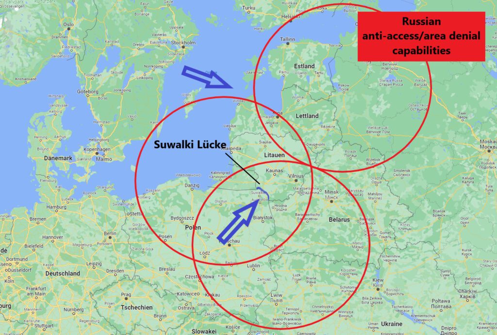 (r.) Anti-Access Area Denial (A2/AD)-Abdeckung Russlands und Darstellung möglicher Transportwege der NATO durch die Suwalki-Lücke bzw. über Umweg über die Ostsee.