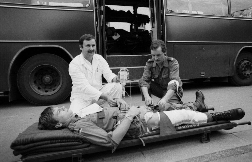 (r.) Krankentransportbus Sanitätskräfte verladen einen verletzten Soldaten in den Krankentransportbus während des Herbstmanövers Wehrhafter Löwe in Hessen 1983.