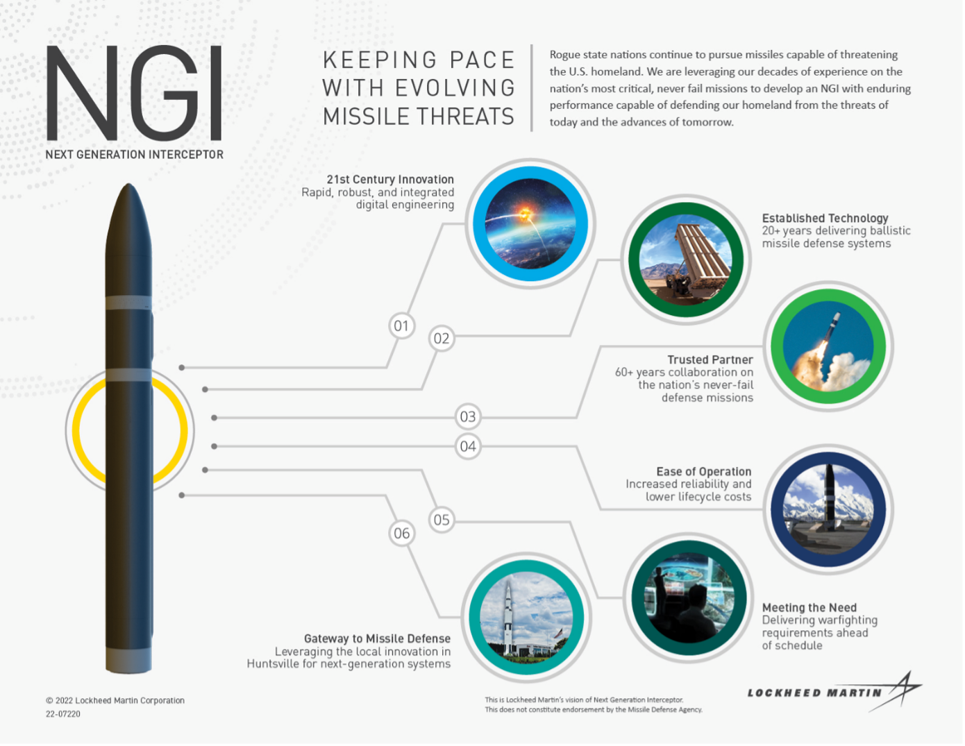 Mit dem Abfangjäger der nächsten Generation (Next Generation Interceptor, NGI) sollen die USA und ihre Verbündeten mit einem modernen, nie versagenden Waffensystem vor den zunehmenden und sich weiterentwickelnden Bedrohungen durch ballistische Flugkörper geschützt werden. Wie aktuell dieses Thema ist, zeigen die aktuellen Entwicklungen und Tests entsprechender Raketensysteme durch Russland, Nord-Korea oder den Iran.
