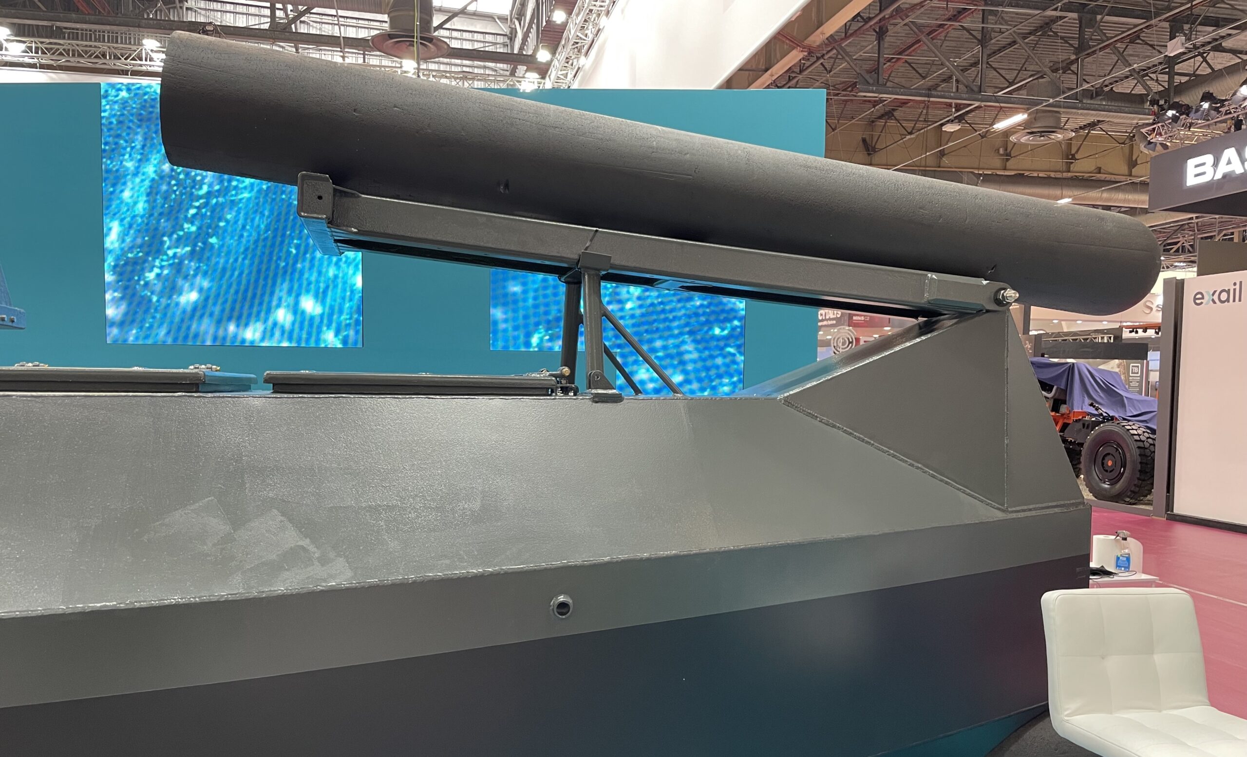 Das UAV kann mit verschiedenen Waffen ausgerüstet werden, darunter Torpedos, Minen und Drohnen, und unterstützt sowohl autonome als auch ferngesteuerte Missionen. Es verfügt über fortschrittliche elektronische Gegenmaßnahmen, verschlüsselte Kommunikation, KI-fähige optische und Wärmebildkameras sowie mehrere Kommunikationssysteme für zuverlässige und sichere Operationen. Zur Aufklärung verfügt das Boot über eine kabelgebundene Drohne. Am Bug ist ein Startbehälter für einen Torpedo zu sehen. Seitlich sind bei dem Mock-Up je drei Seeminen zu erkennen.