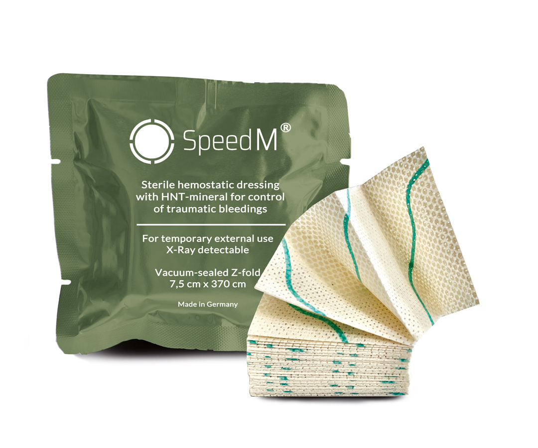 SpeedM von Speed Care Mineral ist ein jetzt erstmals CE-zertifizierter hämostatische Notfallkompresse insbesondere für den Einsatz bei stark blutenden (Schuss-)wunden. Der Hersteller will mit SpeedM einen neuen Standard für die Behandlung von lebensbedrohlichen Blutungen einführen und deutlich ältere Produkte bei der Bundeswehr und anderen Streitkräften ersetzen.