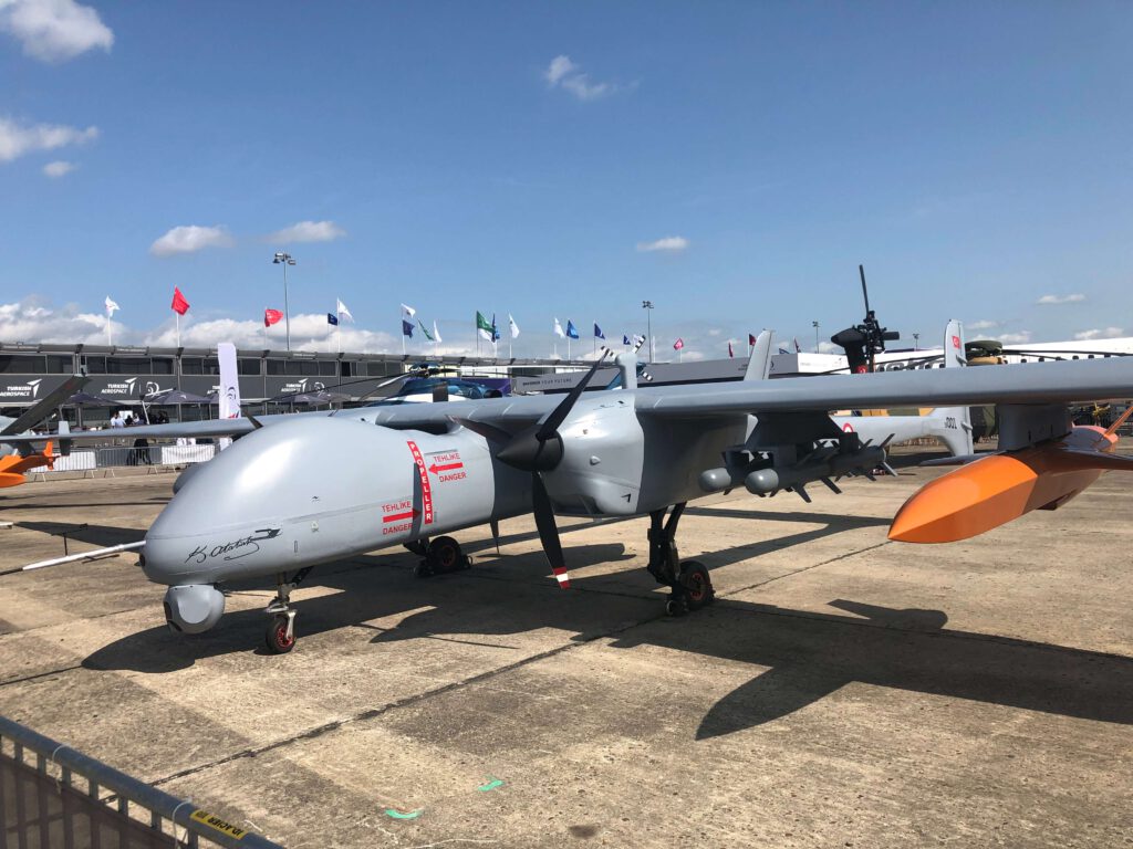Ebenfalls in Paris vor Ort war die Drohne AKSUNGUR von TAI, mit einer Spannweite von 24,2 m, einer Flugdauer von bis zu 50 Stunden und einem maximalen Abfluggewicht von 3.300 kg. Sie kann für Luft-Boden- sowie Luft-Maritime-Einsätze bewaffnet werden.