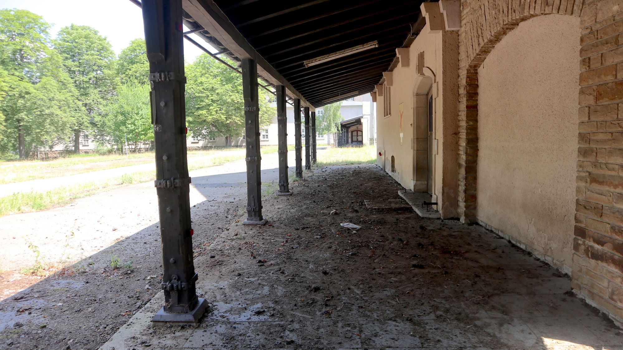 Sträucher und kleine Bäume wachsen aus hochgedrückten Pflastersteinen, Fenster von Unterkunftsgebäuden sind blind vor Staub – oder geborsten. Unter dem Schleppdach liegt zentimeterhoher Tierkot. Schafe und Ziegen, die im Schatten der denkmalgeschützten Gebäude Kasernengras wiederkauen.